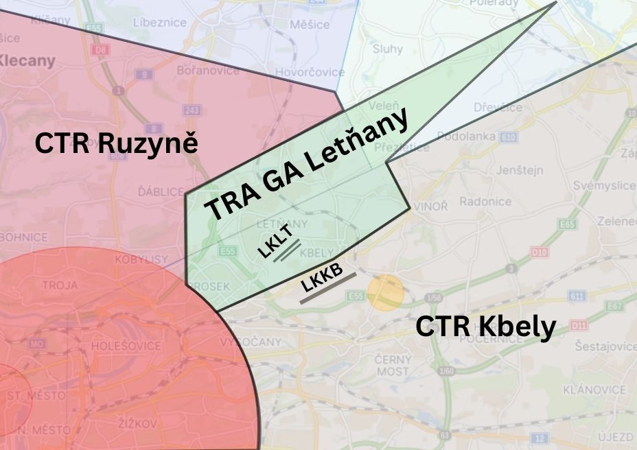 TRA GA je dočasně vyhrazený prostor třídy G. V TRA GA komunikujete se stanovištěm Letňany RADIO, což je informační služba a poskytuje informace o známém provozu. Pro vstup nepotřebujete povolení, ale svůj vstup musíte oznámit. Nepotřebujete odpovídač, ale TRA GA Letňany je RMZ (Radio Mandatory Zone), takže potřebujete rádio. Na obrázku níže je TRA GA znázorněná zeleně.